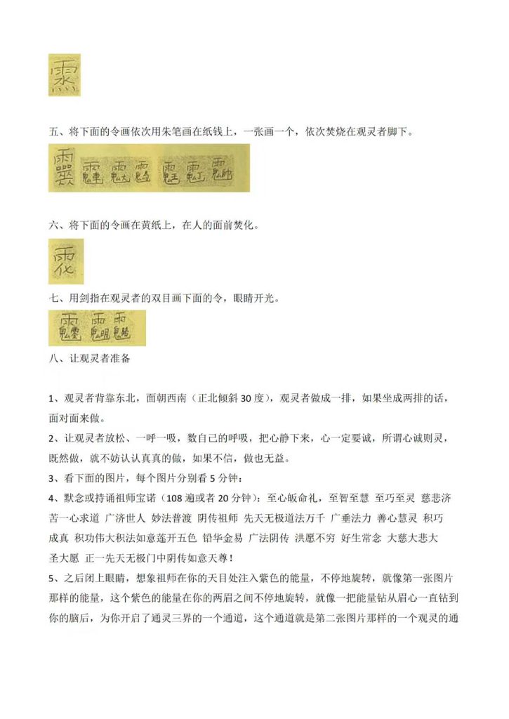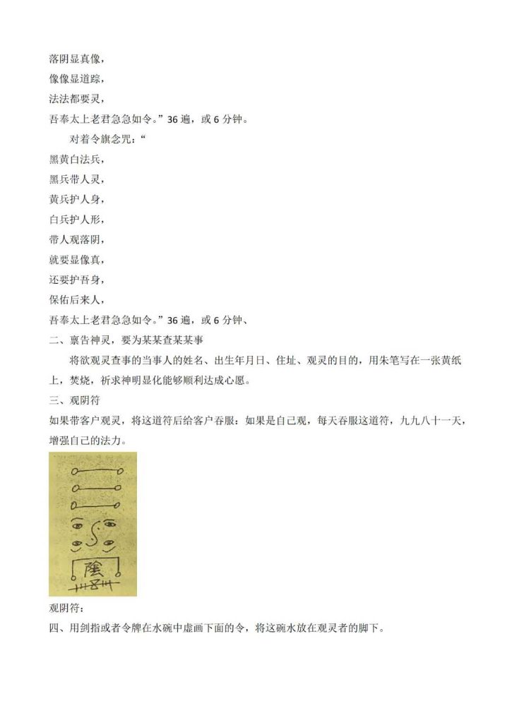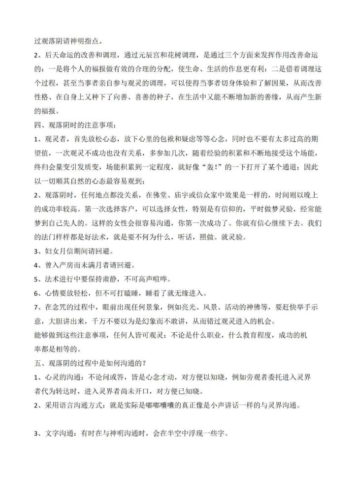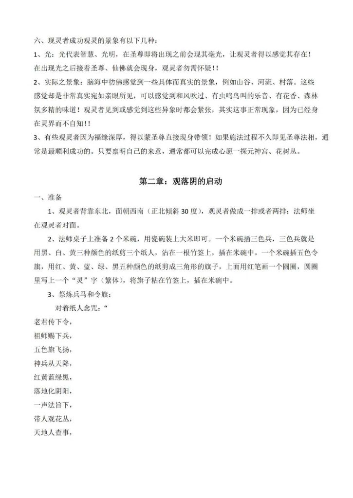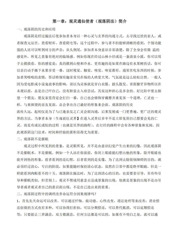 观灵通仙使者(观落阴法)简介、观落阴的启动、观生命花树、观落阴查前世、请祖师化解冤亲债主法、观祖先安稳法及调理、观阴宅法、观财库法、观元辰宫改运法、观元辰宫神坛和兵马法、元辰宫请财神调理财运法、请神赐法和兵马转运法等…