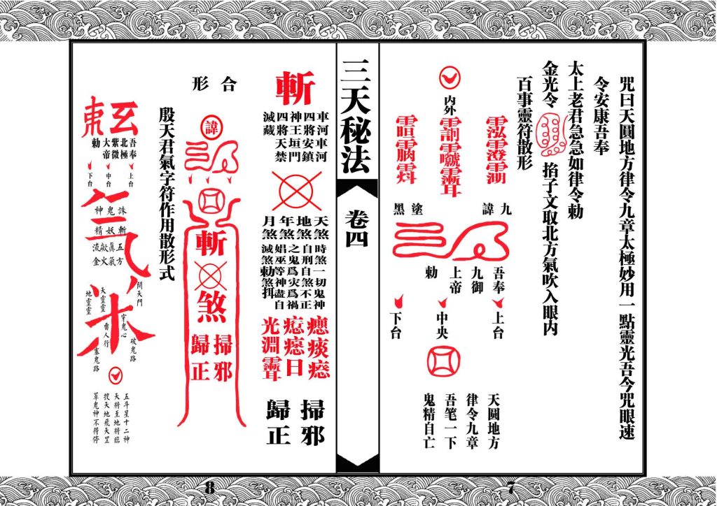 内含:原书共七卷,乃道教净明派祖师九州太史神功妙济真君许逊著,内容分别是:掌诀法旨卷之一,取气秘诀卷之二,天罡备要秘旨卷之三,天罡备要卷四(画符),天罡备要卷之五(取三光气法),天罡备要卷之六(取诸气法),诸将召会卷之七(雷帅招请)