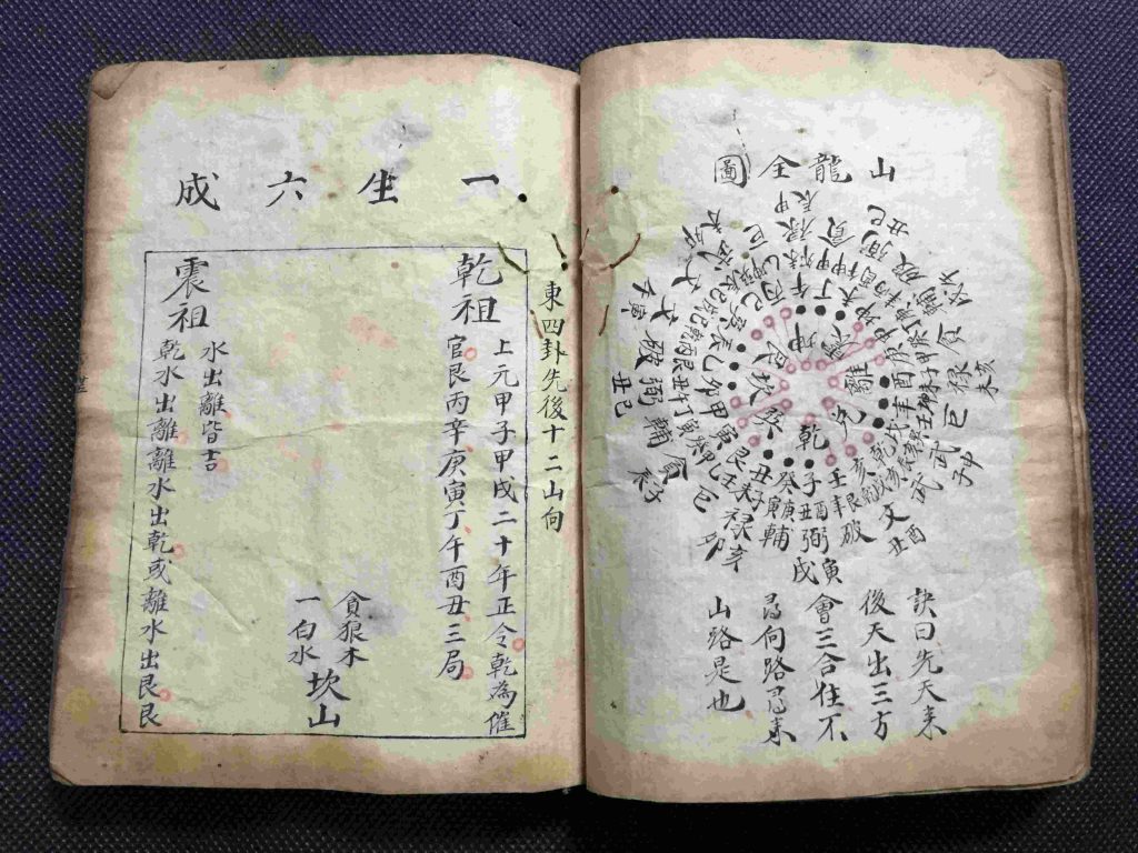 一本祖传风水地理秘籍珍本,内含东西明来去干支水口图,山龙全图,东四卦先后十二山向,西四卦十二山向,东四卦龙局山水挨星总诀,西四卦龙局山水挨星总诀,山龙,平洋水龙,四十八局安排先后掌诀式,八卦变动九宫图,八卦变动九星总诀,东卦挨山诀,西卦挨山诀,天根月窟解,水路夹杂断等