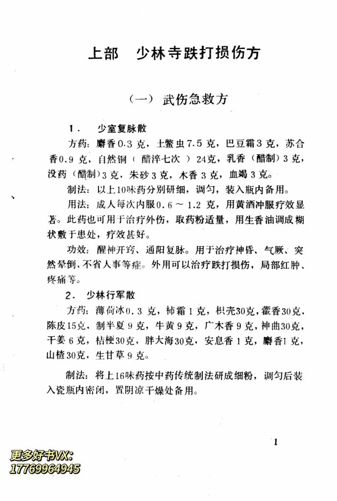 由少林寺住持僧德禅传授、皈依弟子德虔执笔,汇集寺院从古到今七十余位高僧的秘方、验方编写而成。全书分两部,上部跌打损伤三百方;下部内伤杂病二百五十四方。包括练功方和健身法。每方均讲述了药物组成制法、用法、功效、主治及治疗经验。书末附有嵩山少林寺地区出产的地道药材和德禅法师的简介。