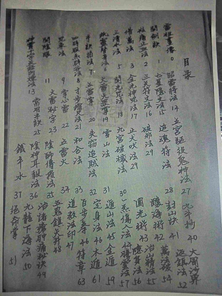 内容包括:开阴眼 隐身法 腾云法 缩地成寸(寸步缩尺法)金遁 木遁 祛痛止血法 四时服气辟谷法 咒枣法 神霄十字天经内炼法 昭雷将法 七星隐文法 金光神咒法 开光咒法 火雷天罡掌 五雷掌 掌心雷 常用手诀 追魂符法 破邪法 止犬咬法 九宫破秽法 雪山法 失窃追贼法 和合法 五雷火 阴师传授法 阴神耳报法 铁牛水 九牛抄 封山诀 酿海术 圆光术 一气伤人法 遁山法 定身法 五鬼锁天井 九龙下海法 绝命掌 绝命咒 大周沙界返镇法 万法破 治山精鬼魅法 忌书符日 祝由符章 先天符箓度厄神章 后天实用符章。