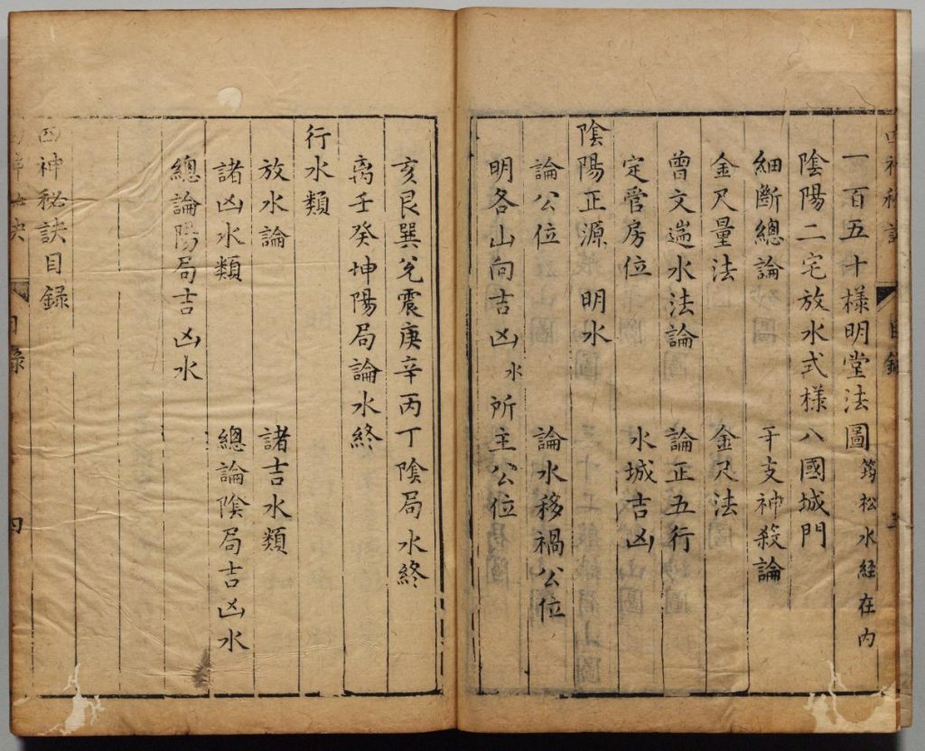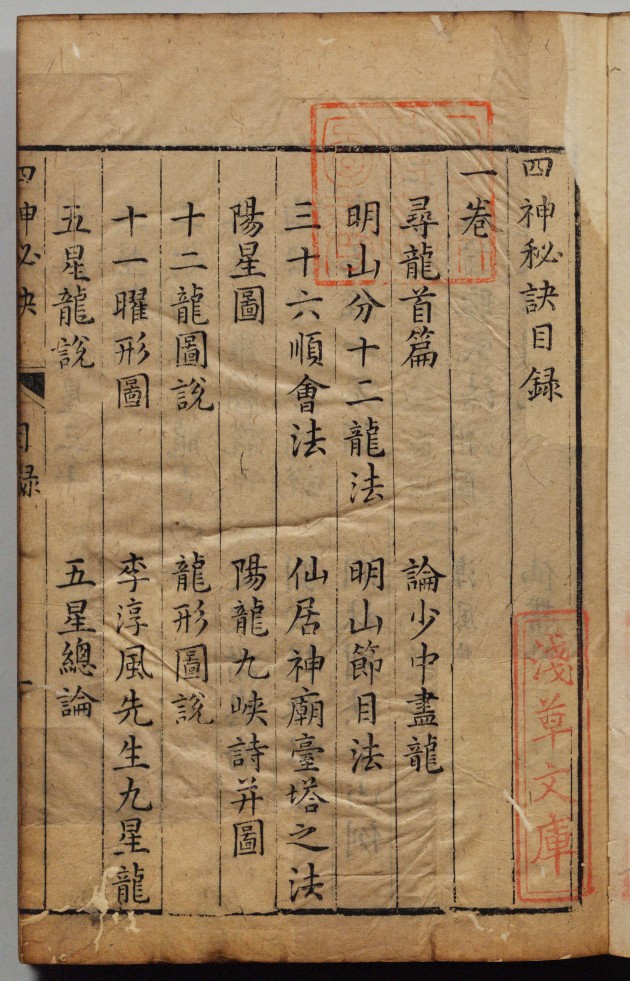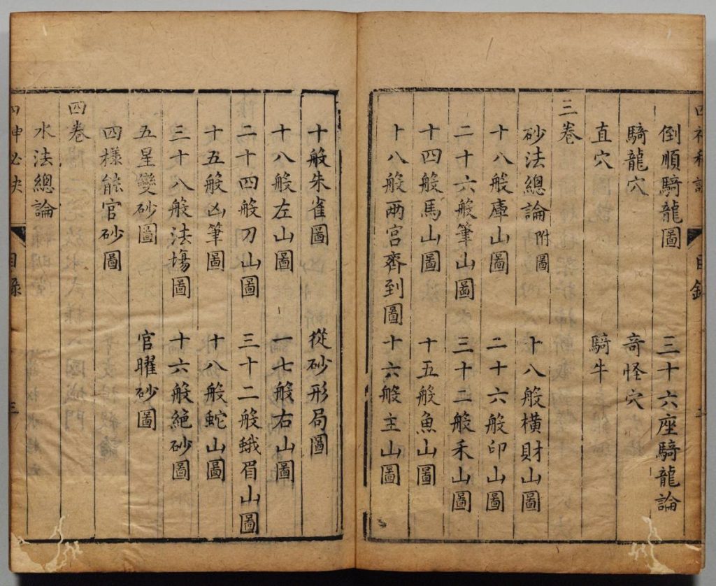 全书四卷,内容包含:寻龙篇、明山分十二龙法、三十六顺会法、阳星图、十二龙图说、龙行图说、二十四位行龙吉凶论、格龙下罗图说等等