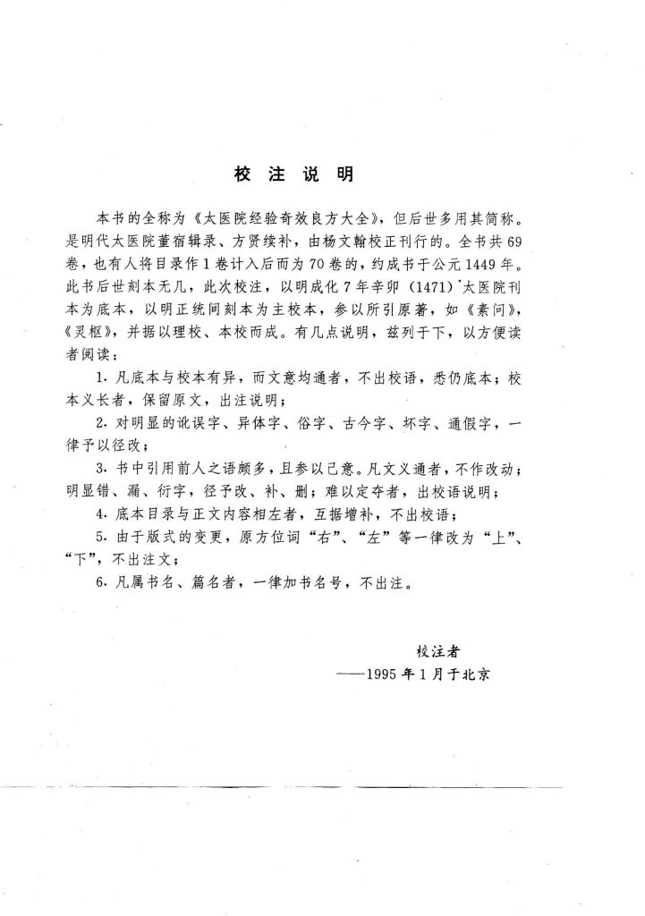 此次校注,以明成化7年辛卯 (1471)太医院刊本为底本,以明正统间刻本为主校本,参以所引原著,如《素问》,《灵枢》,并据以理校、本校而成。