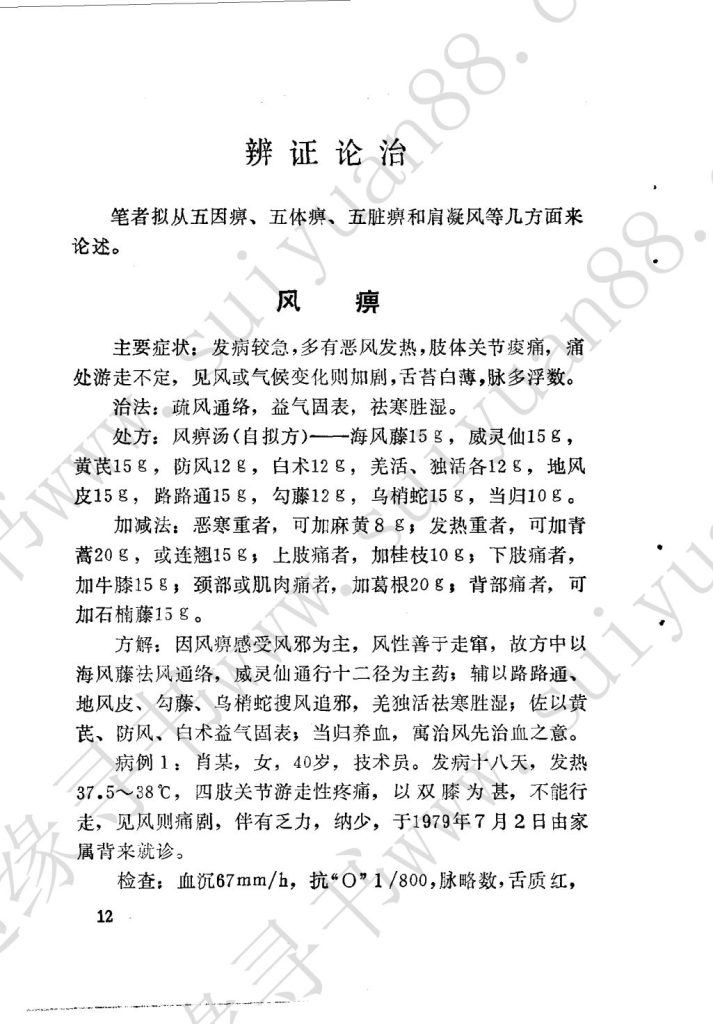 全书共九部分。包括痹证的概念与范围、前贤论萃、病因与分型、辨证论治、辨病治疗、其他疗法、用药心得、验方集锦和痹证杂论等。其辨证论治部分介绍有风痹等十二种痹证的证治,每证按主要症状、治则、处方、加减法、方解、病例等项叙述。并录有古今效方药一百零六首,雷公藤治疗类风湿关节炎十年期疗效分析等。