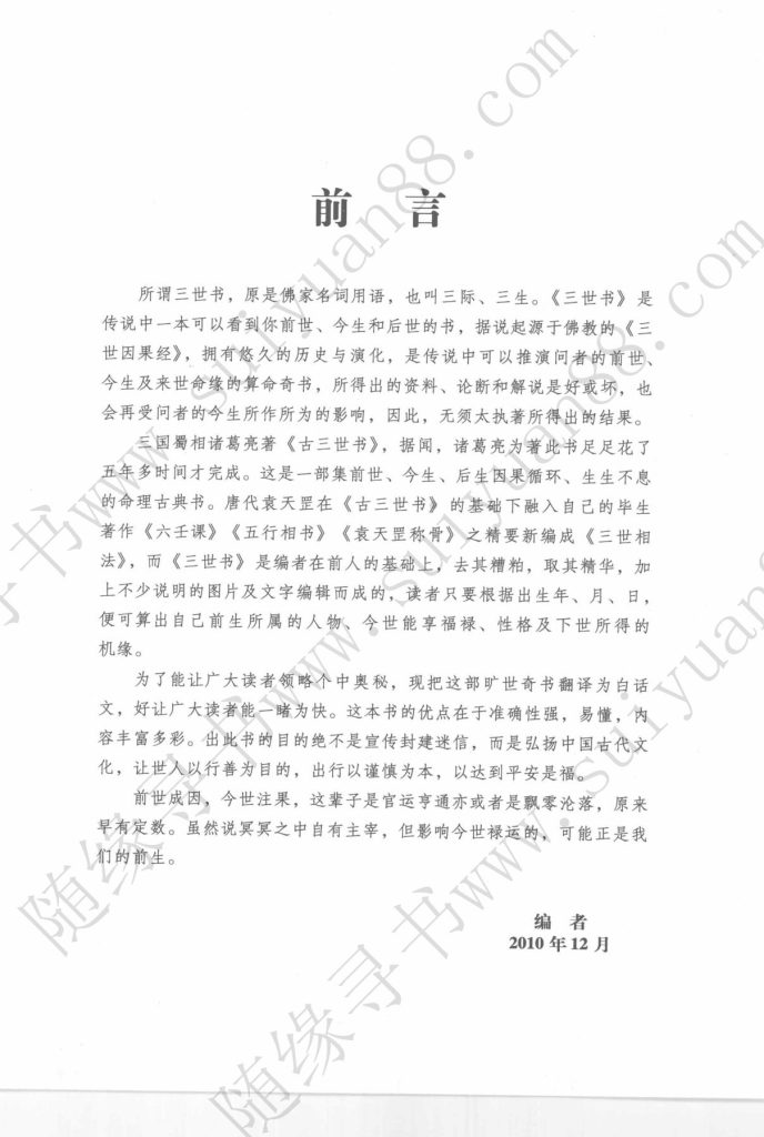 《三世书》是传说中一本可以看到你前世、今生和后世的书,据说起源于佛教的《三世因果经》,拥有悠久的历史与演化,是传说中可以推演问者的前世、今生及来世命缘的算命奇书,所得出的资料、论断和解说是好或坏,也会再受问者的今生所作所为的影响,因此,无须太执著所得出的结果。