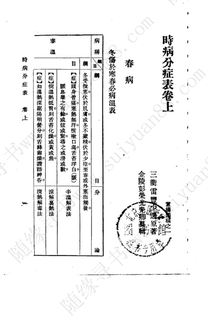 外感病专着。三卷。彭光卿辑。初刊于1941年。本书将雷丰《时病论》以表格形式加以归纳和整理。分述时病的病证、治疗诸法及成方。治疗诸法用歌括加按语的形式予以概括和阐析,条理比较清楚。1955年上海书局重印出版。