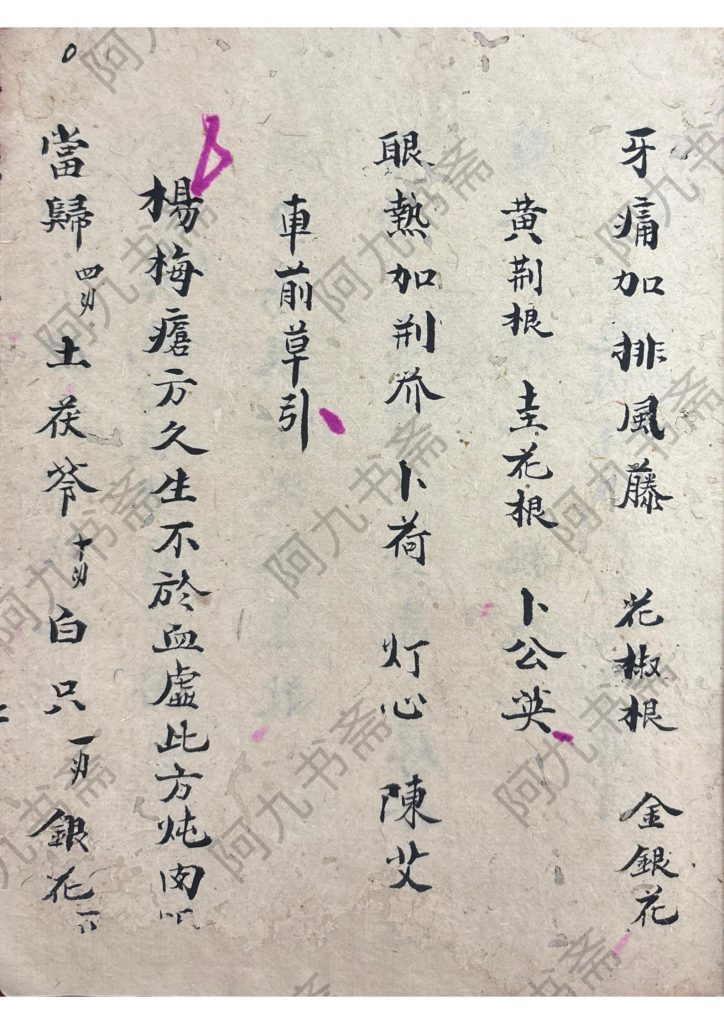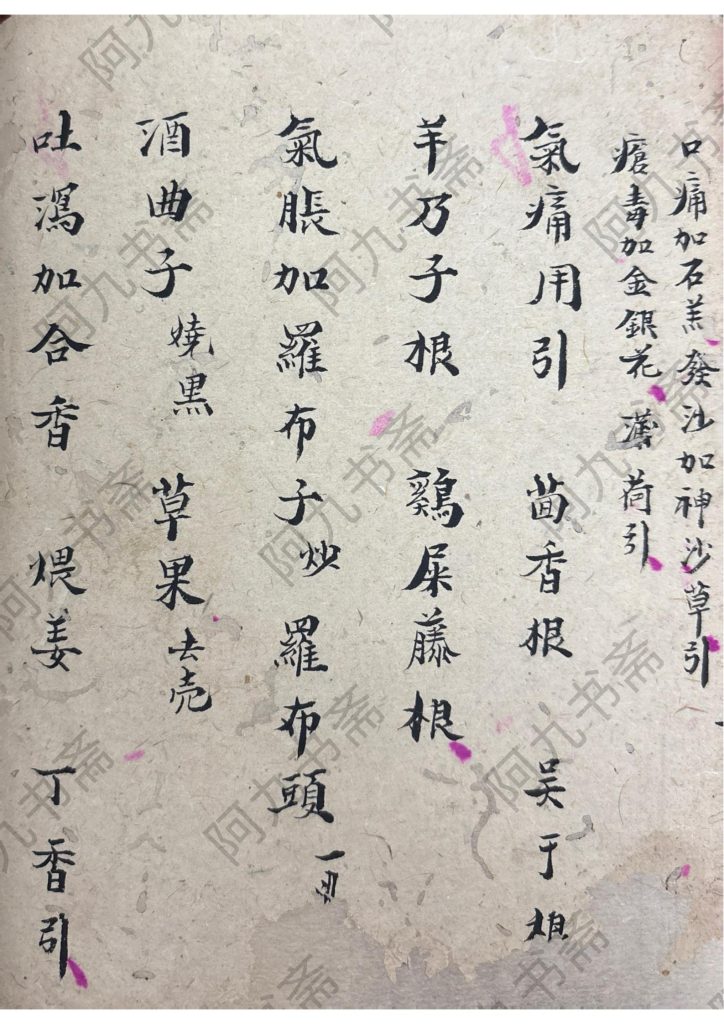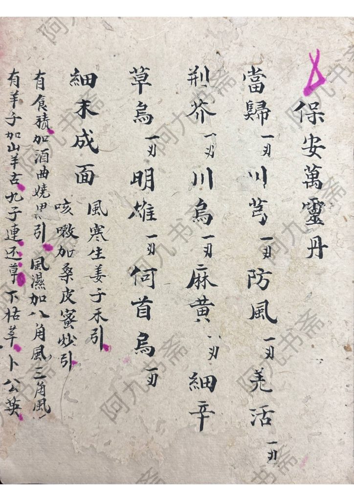 [烟花]内容包含:膏丹丸散、保安万灵丹、跌打伤用方、止血用、乌龙膏、疯狗咬方、五虎下西川治杨梅疮等。