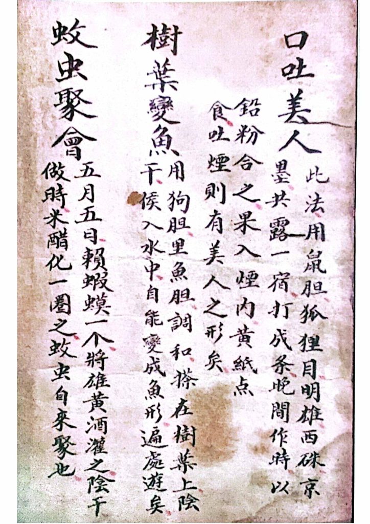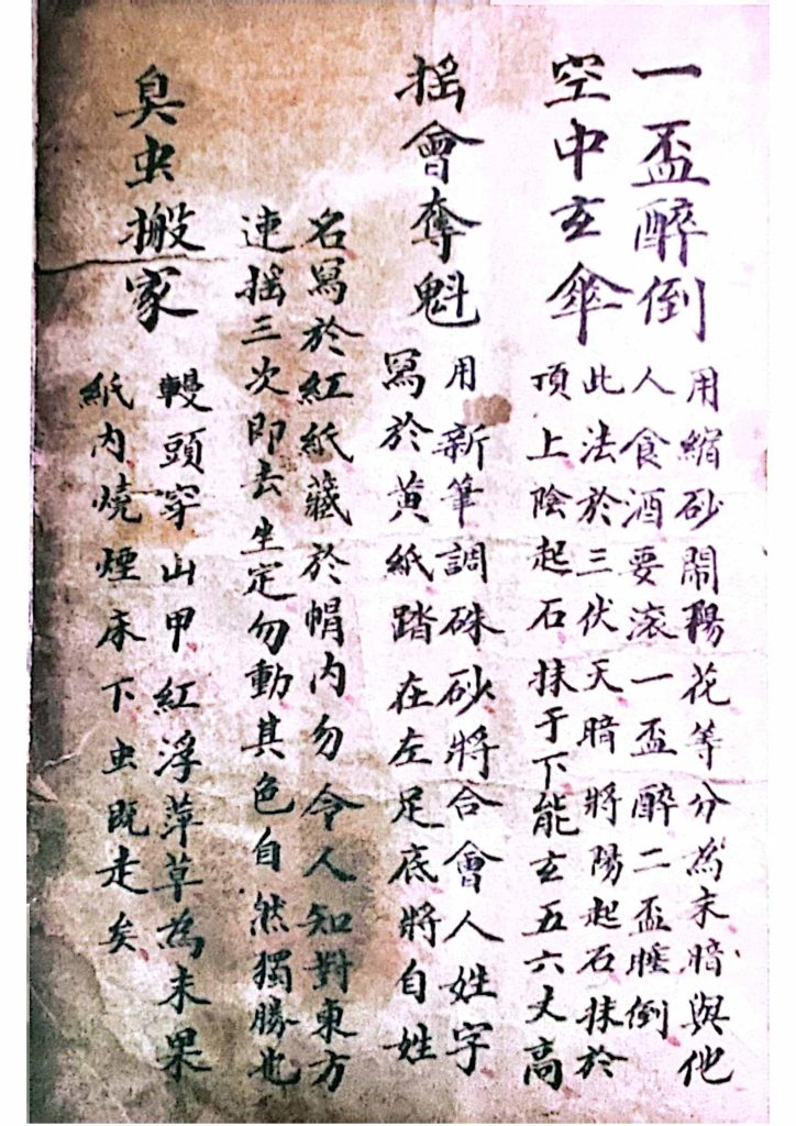 内含:一盃醉不倒、空中玄伞、臭虫搬家、口吐美人、树叶变鱼、眉毛搬家、带子变蛇、夜战不女、蛋内有字、使鬼打门、美女自来、自言真情、白日收鼠、雪中暖酒、恶太不咬、渡江不恐、喂猪易肥、养猪不长、记女守闺、喝钱呼骰、单日双日出行法诀、定惊法诀、总神咒、太上隐形法、开门法、定身法、神弹法、避箭法、缩地法、挥剑成河法、飞钱法、迷睛取物法、黑虎搬运法、大翻身法、消化肿毒灵符神咒极验奇方等等。