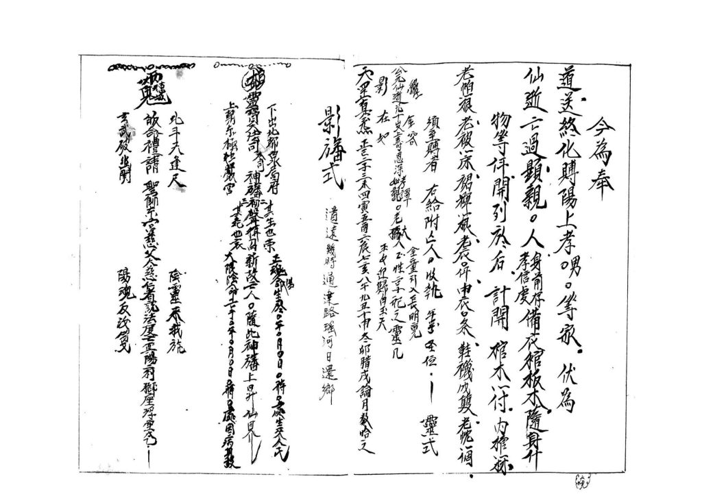 内容包含:玄门安葬科仪,发架一宗,玄门安厝辞灵一宗,通关路引式,影旛式,应柒单式,出魂白语,正一玄门纳契科仪,正一玄门启白科仪,玄门安厝交化赙一宗,玄门召请入壇后安位献食一宗,小圆蒲一宗,正一安家龕一宗,扫光一宗,玄门安葬吉日,收掩赤口秘旨等。