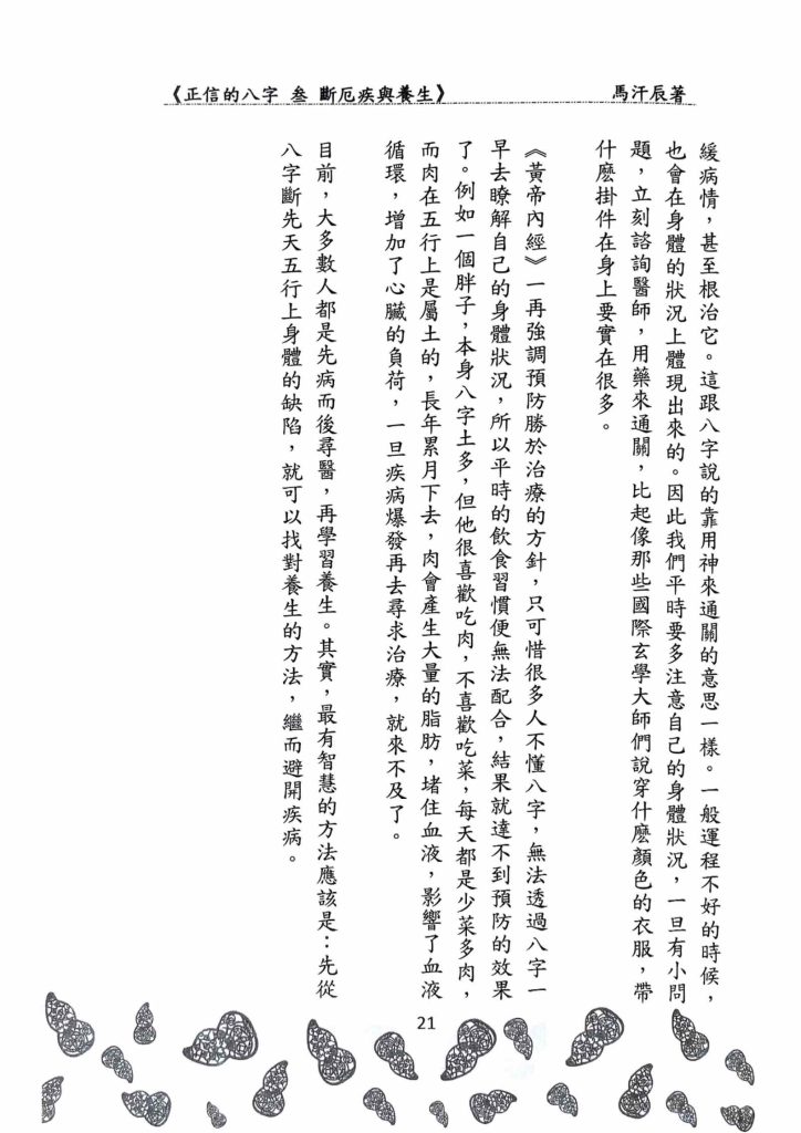 八字论命,有个环节,就是断厄疾,在笔者研究的众多案例之中,发现命格的先天体质,从出生的生辰八字可以得到很重要的启示,值得我们重视。此书列出五十多个实例宫读者参考。了解了先天体质,从小养成良好的生活习惯,配合适当的饮食,相信可以达到养生的目的,除了避免疾病,也可延年益寿。每个人的健康,影响到每个人的曼陀罗。也就是说,涉及到身边的亲朋好友,甚至几代人,故此,请多重视。