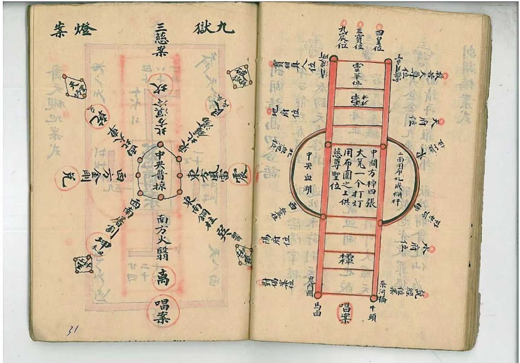 内含:发奏申品、净水品、颁诏品、天堦发符召将品、行遣将品、焚送品、开启品、建旛品、安寒林品、安左右班品、安洞案品、宿坛品、宿坛语、安座意语、颁符放赦品、破狱品、请高功语、召亡品、祭炼意字做法、放金龙、做接魂梯、洛书四十五灯图、收禁口授等