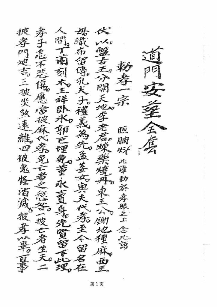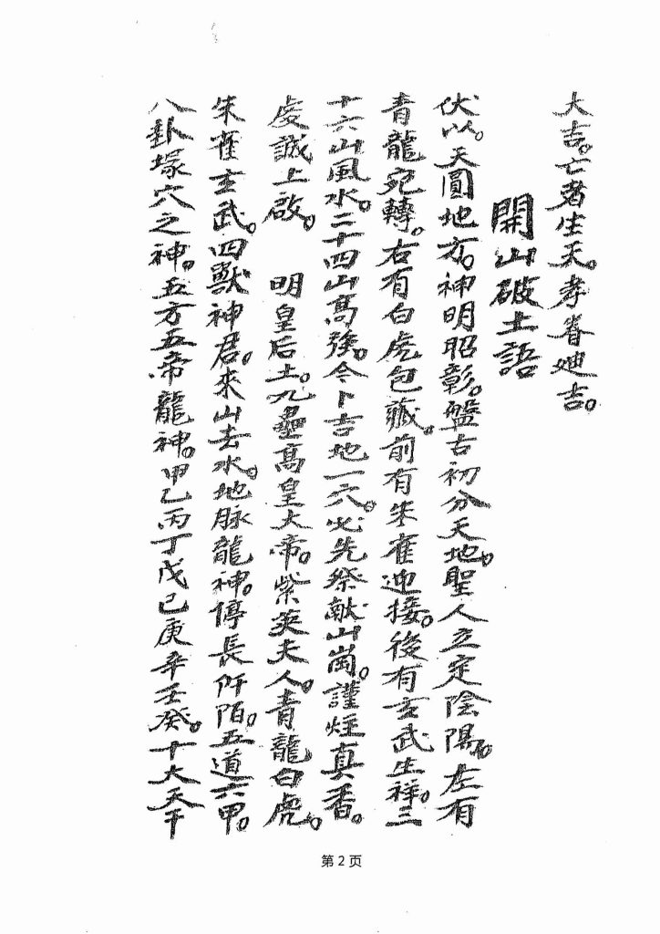 敕孝一宗、开山破土语、给地契语、画八卦语、散禄米语、迎棺下语、掩土语、回灵语、安灵语、補土复山语、祝龙语、画卦语、扫塘语、地师接米答曰、画卦已周赞卦语、下肄语、嘱龙文、掩土文、掩土二章、八经八、给契语、复山语、地契式、又契约、退土式、收丧臭秽用、雪山秘法、收丧秘法、收丧真言、治邪巫师捷法、堂祭文……丧葬