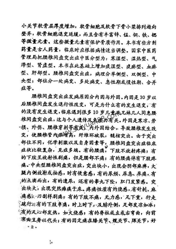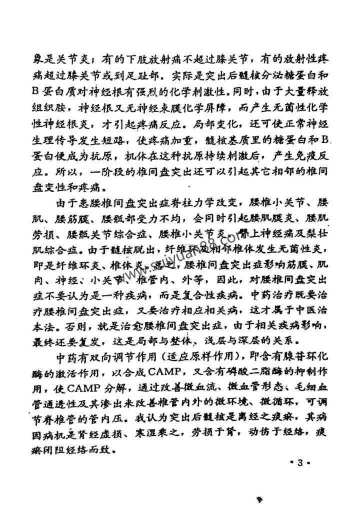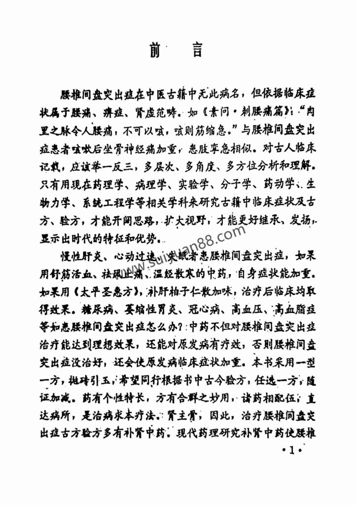腰椎间盘突出症在中医古籍中无此病名,但依据临床症状属于腰痛、痹症、肾虚范嗨。如《素问·刺腰痛篇》:.“肉里之脉令人腰痛,不可以咳,咳则筋缩急。”与腰椎间盘突出症患者咳嗽后坐骨神经痛加重,患肢挛急相似。对古人临床记载,应该举一反三,多层次、多角度、多方位分析和理解。只有用现在药理学、病理学、实验学、分子学、药动学、生物力学、系统工程学等相关学科来研究古籍中临床症状及古方、验方,才能开阔思路,扩大视野,才能更好继承、发扬,显示出时代的特征和优势。