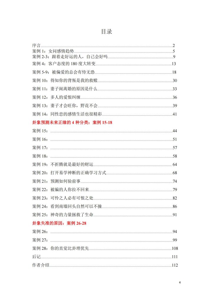 本书共有 100 多页,4万余字,所列举的案例虽然不多,但个个都有微信聊天截图,一方面确保真实性,同时也把案例变得故事化。大家在学习每一个案例的时候,减少学习理论的枯燥乏味感,更像是读一个故事,可以让自己带入故事的场景,体验周易的乐趣。