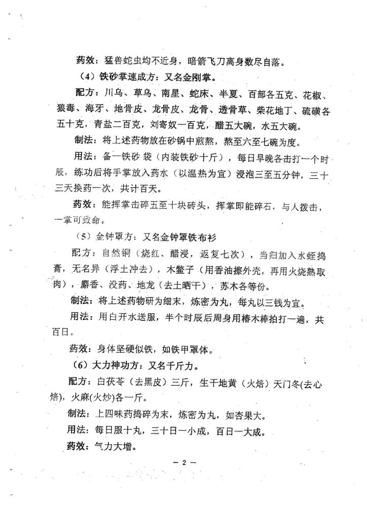 一、功家速成秘药:1.抗打药方2.铁甲秘方3.蛇虫不近身方4.铁砂掌速成方5.金钟罩方6.大力神功方7.透视秘方8气功速成丹。