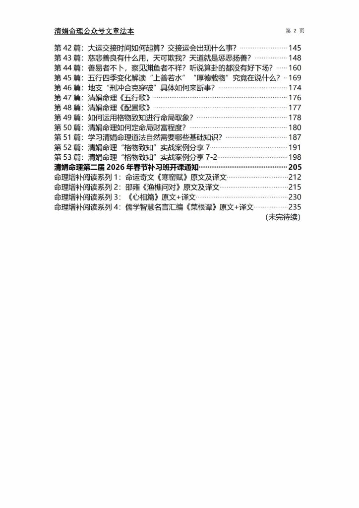第53篇:清娟命理”格物致知”实战案例分享7-2198清娟命理第二届2026年春节补习班开课通知.—.205命理增补阅读系列1:命运奇文<<寒窑赋>>原文及译文–212命理增补阅读系列2:邵雍<<渔樵问对>>原文及译文-215命理增补阅读系列3:<<心相篇>>原文+译文….230命理增补阅读系列4:儒学智慧名言汇编<<菜根谭>>原文+译文235