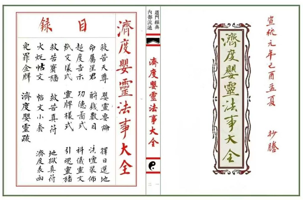 内容如下:婴灵要论,择日选地,命屬星君,酧钱数目,法坛装怖,超度灵示,功德图示,科仪灵人,纸文样式,灵牌样式,引魂灵旛,救苦宝旛,救苦真符,地狱真符,火灹帖文,免罪金牌等…