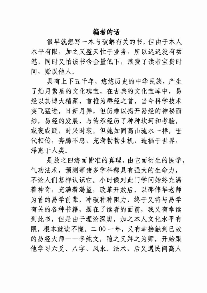 本书所汇集的破解方法,千差万别,有的按易理分析,十分合情合理,有的则看起来好像是一派。胡言乱语,与易经的大道理好象是格格不入,但用起来,确十分有效,这都是师傅经过多年实践,积累起来的丰富经验,用起来十分有效,故作者把它总结出来的。
