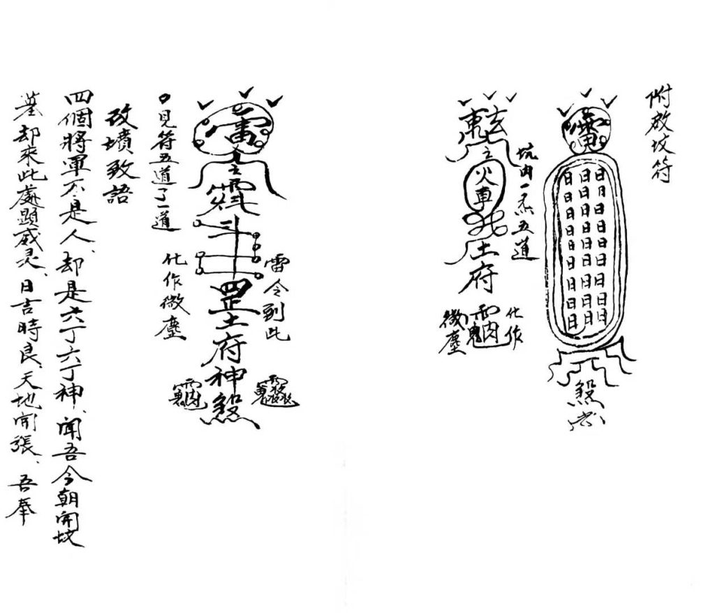 内容:法事如常、解秽、焚香供养退土抽魂保安、召殷帅、剪牲、敕符、开棺本、扫墓归魂入棺闭殓、跳井、举丧下井、发丧、扫墓符、退五符、方土符、府神符、煞符、雷符、退亡人身皇定命符、电符、掩尸符、阴阳土府犯符、阴九牛符、阳九牛符、退千斤符、天车符、开棺符、护身符、镇煞符、退山家土府桃符、破土灵符、保身符5道、秽气符、收尸水秽气、改墓牒、附合坟符、改坟致語。
